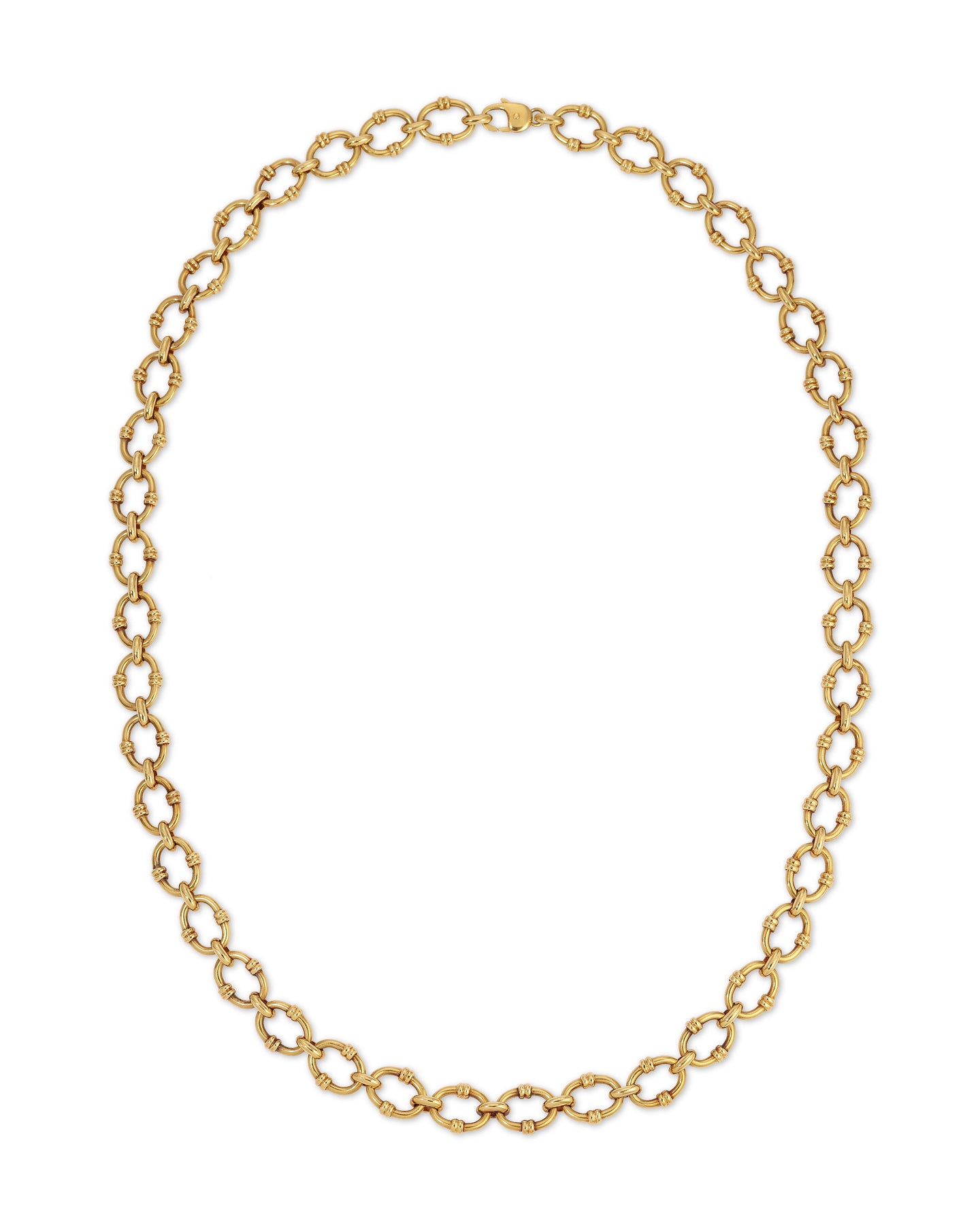 18k yellow gold, designed as an oval-link chain. Links measure 1 1/16 x 1/2 in. Total length: 31¾ in. Total weight: 108.7 grams. Stamped 18k.