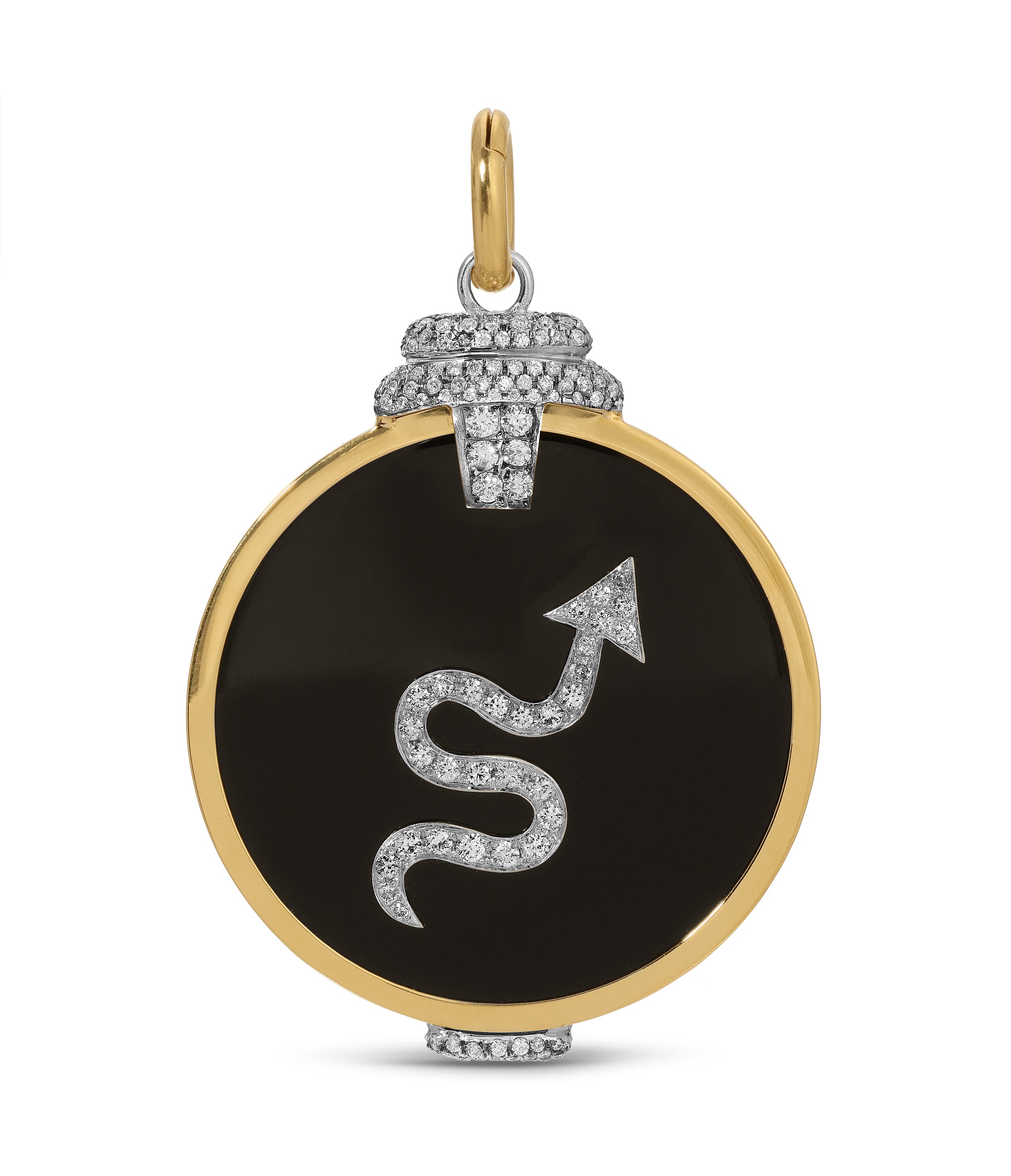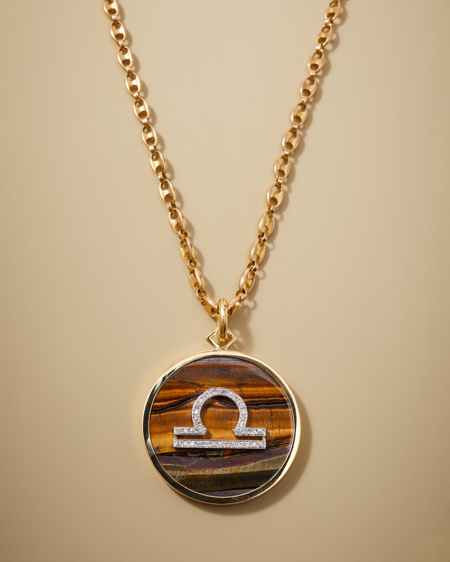 18k yellow gold, flat round tiger's eye with diamonds of E-F color and VS clarity. Measures 2 1/8 x 1 7/8 in. Approximate total weight: 34.1g. Signed Mèrenor, 750.
