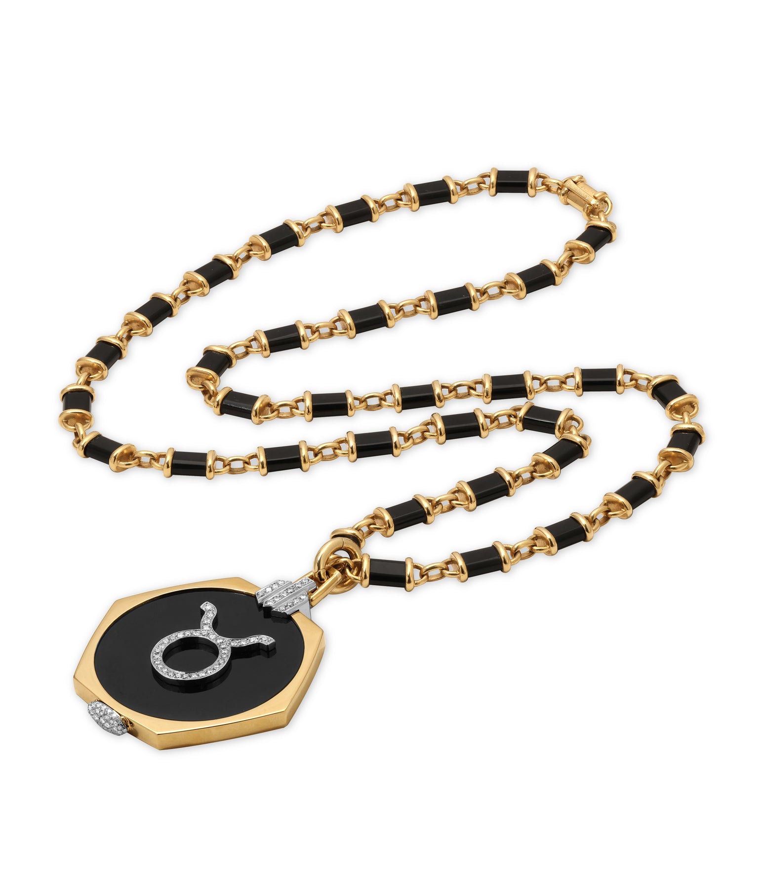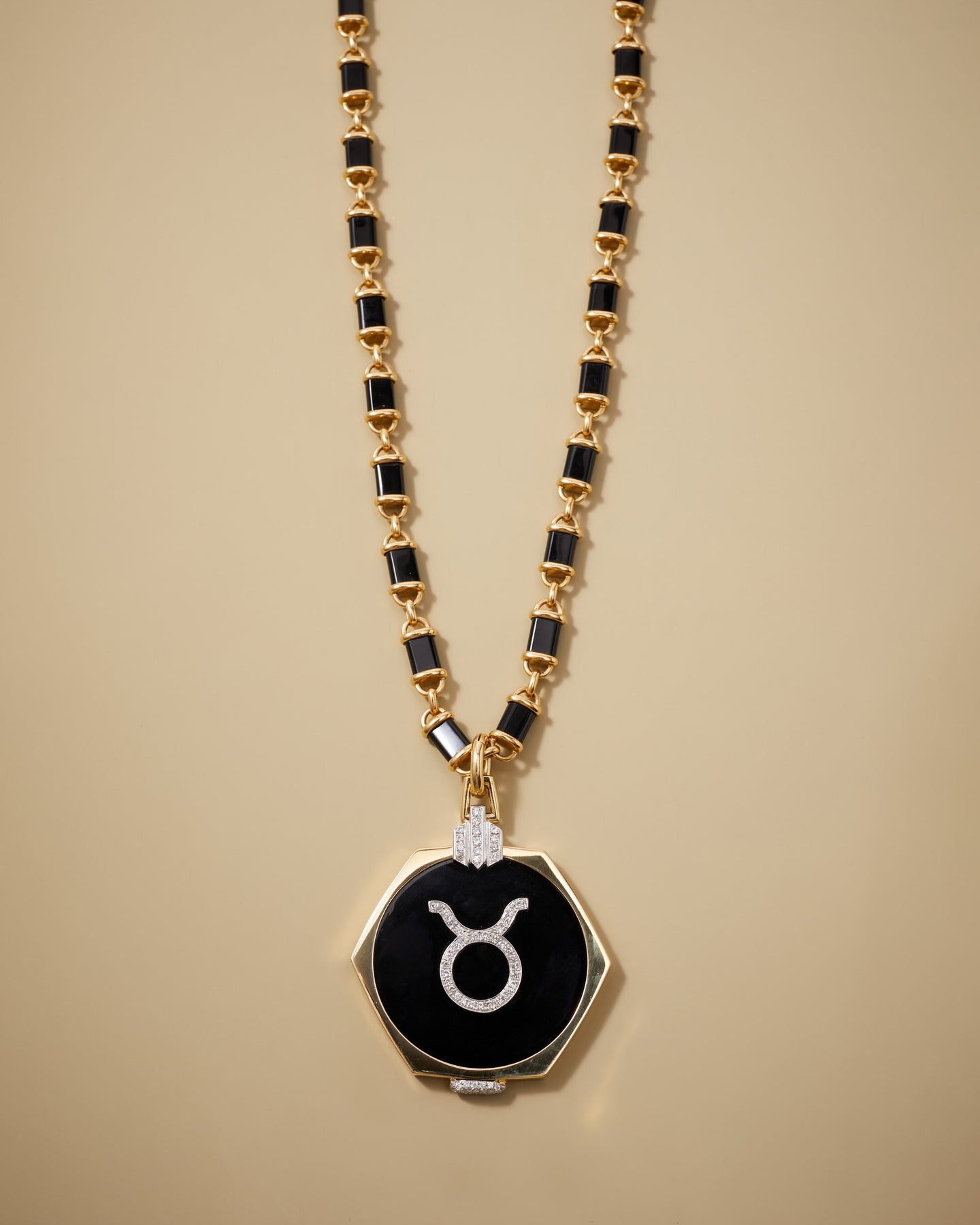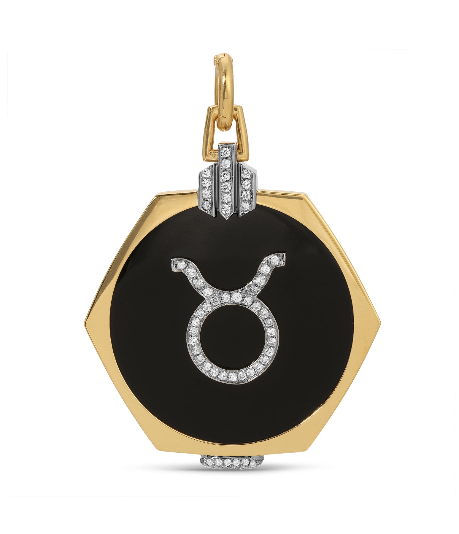 18k gold and platinum, flat round onyx with by 80 round brilliant- and single-cut diamonds weighing approximately 1.20 carats total with G–H color and SI–VS clarity. Measures 2 9/16" x 1 1/8". Total weight: 46.6 grams. Signed Mérenor, 750, PLAT.