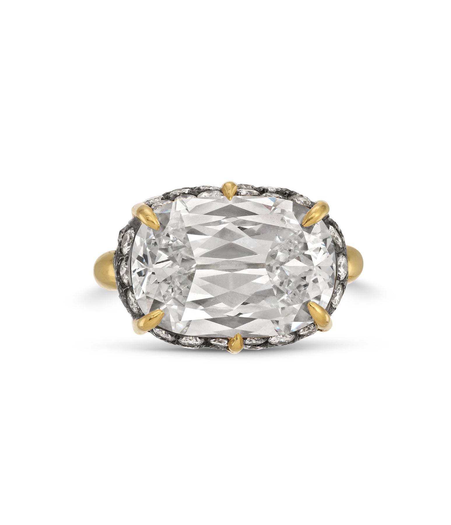 18k yellow gold and blackened platinum ring. Center diamond is a 10.59ct. Criss cut cushion lab grown diamond graded F color and VVS2 clarity. Lab report # IGI LG685538642. Mounting has 48 round brilliant and old mine diamonds weighing approximately 1.18 carats of F-G color and SI clarity. Sizse 6. Total weight: 13.9 grams. Signed Mèrenor.