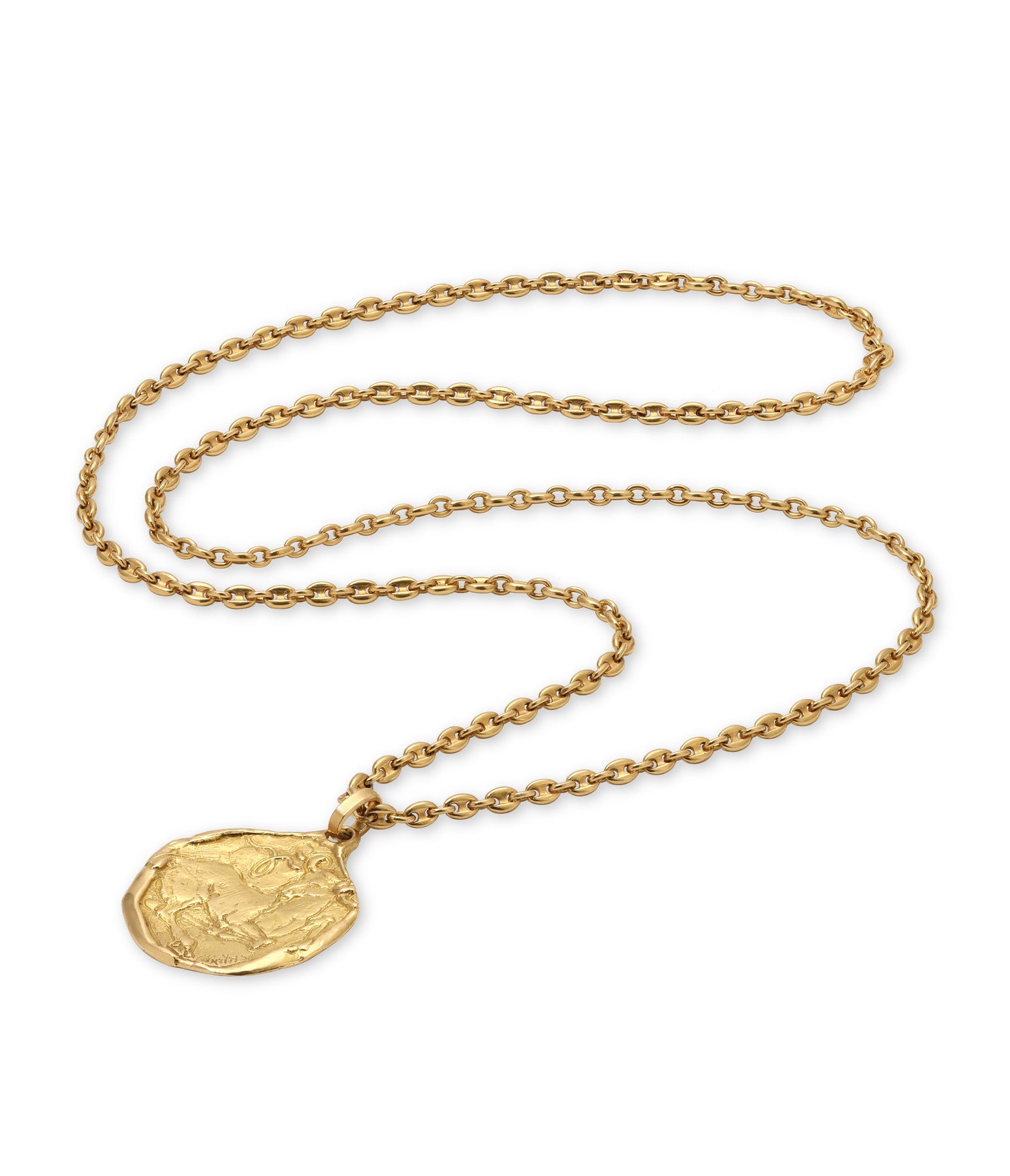 18k yellow gold zodiac pendant with Aries motif. Pendant measures 1.5 x 1.5 in. Pendant weighs 25.0 g. Chain measures 28 in. Chain weighs 53.2 g. Total weight approx: 78.2 grams. Signed Cartier, Made in Italy.