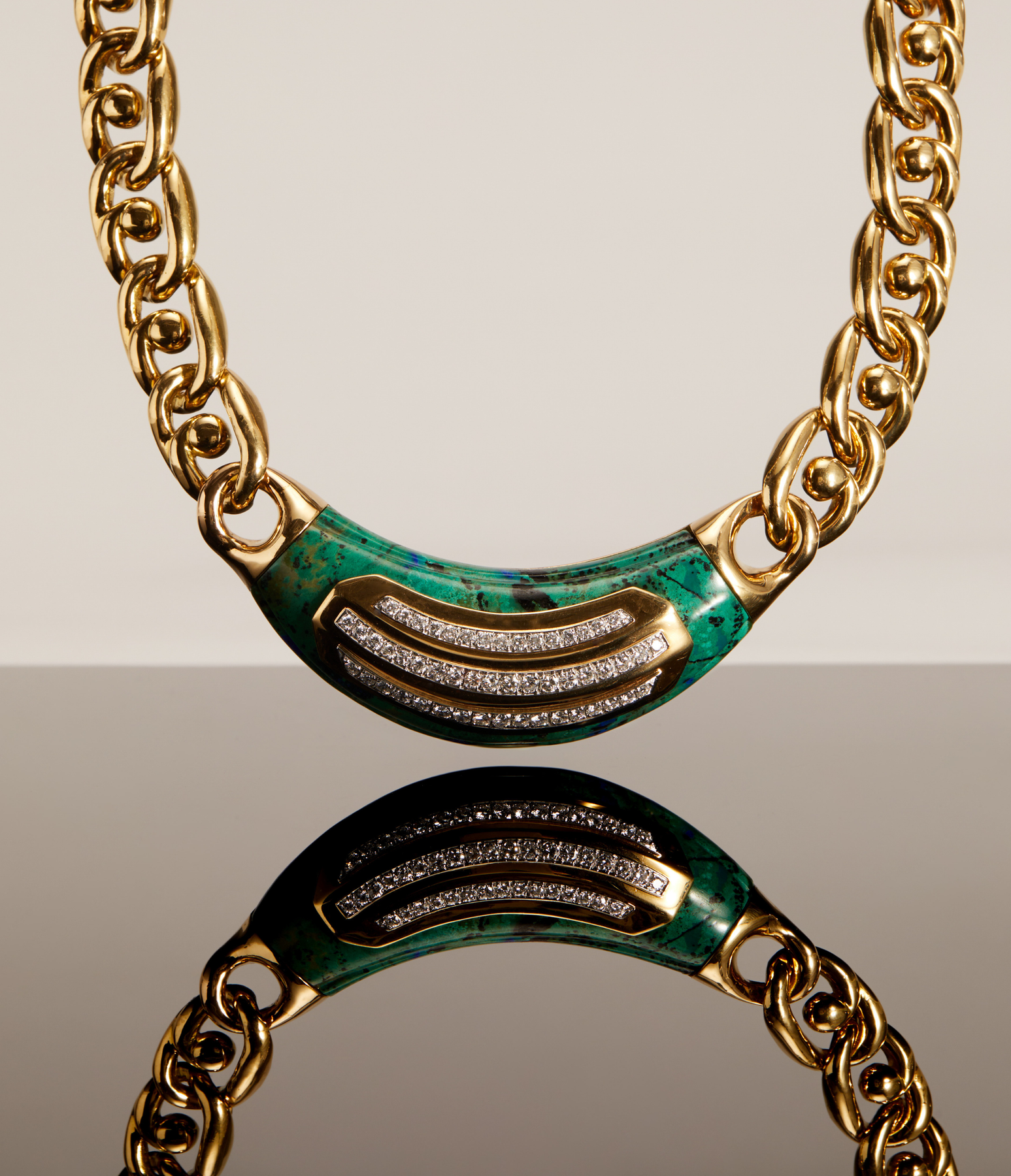18k yellow gold and platinum. Centerpiece with a carved azurmalachite accented by three rows of diamonds. 51 round brilliant-cut diamonds totalling approximately 2.25 carats with E-F color and VS1 Clarity. Fancy curb-link chain with inner circumference 15½ in. Total weight: 167.2 grams. Signed WEBB. With personal engravings.