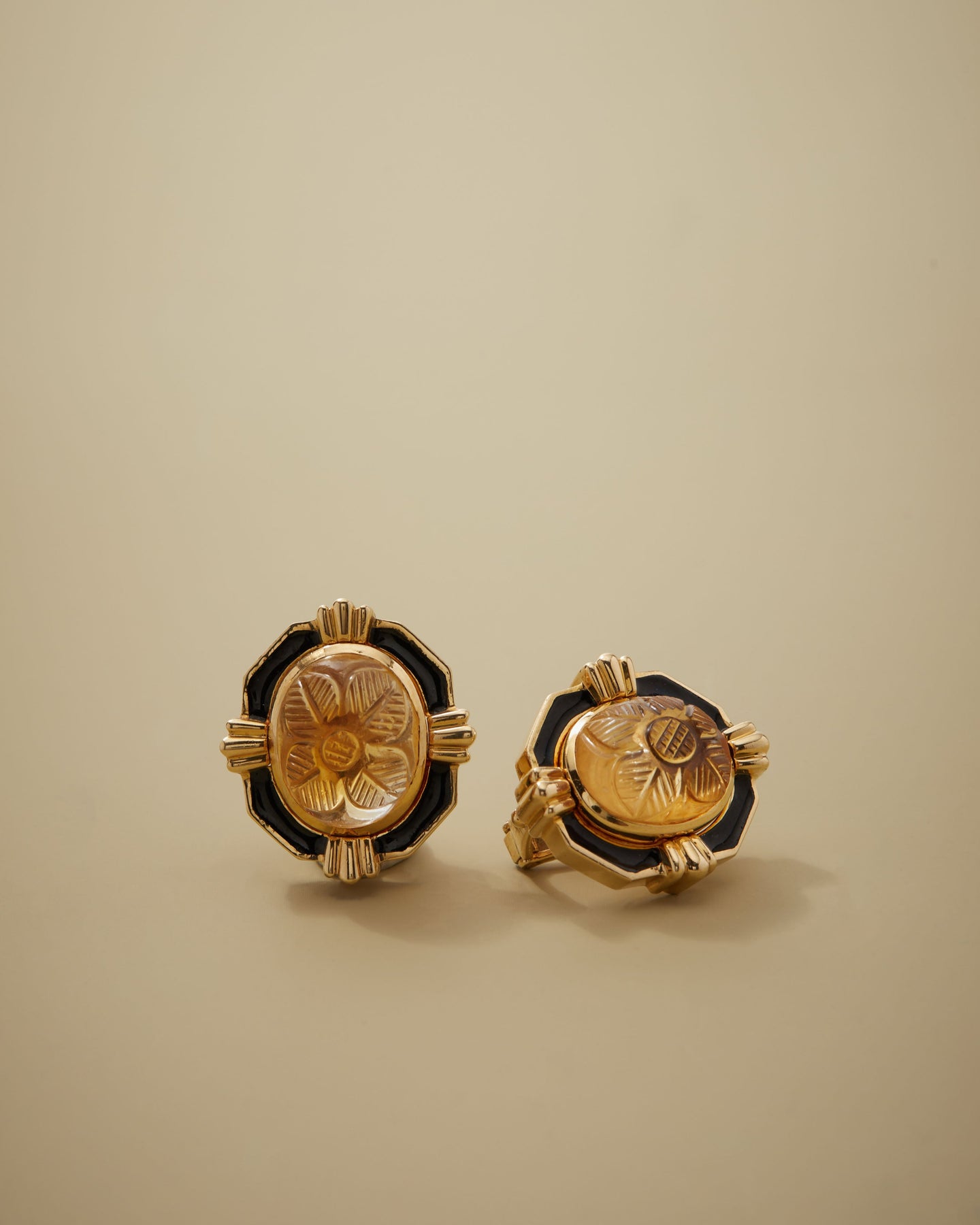 18k yellow gold, carved citrine and black enamel. Total weight 24.2 grams. Signed Webb.