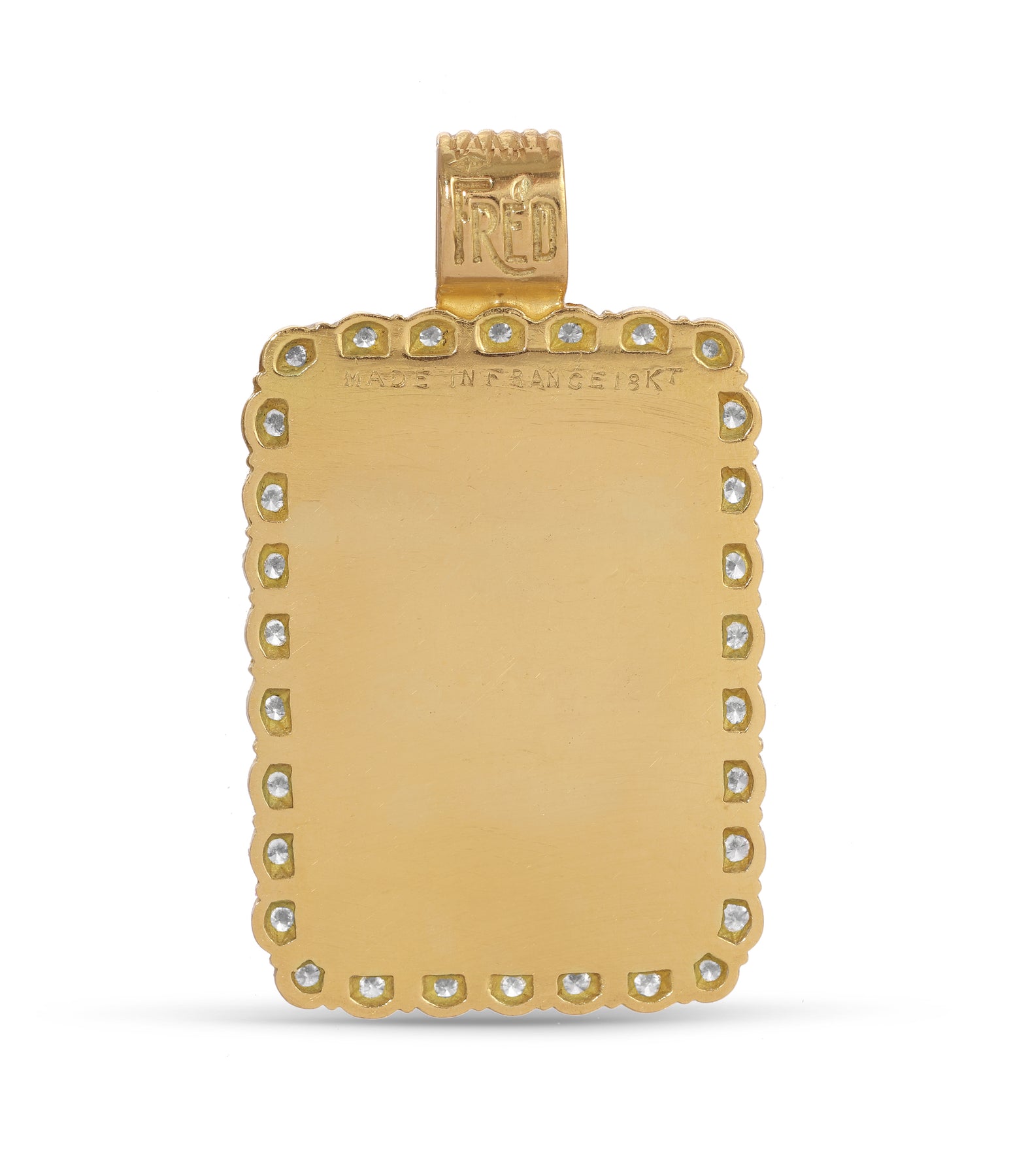 18k yellow gold. 30 bezel set round brilliant diamonds weighing approximately 0.60 carats of E-F color and VS clarity. Measures 1 x 1 1/2 inches. Total weight: 14.6 grams. Stamped FRED, Made in France 18KT. Eagles head stamp.