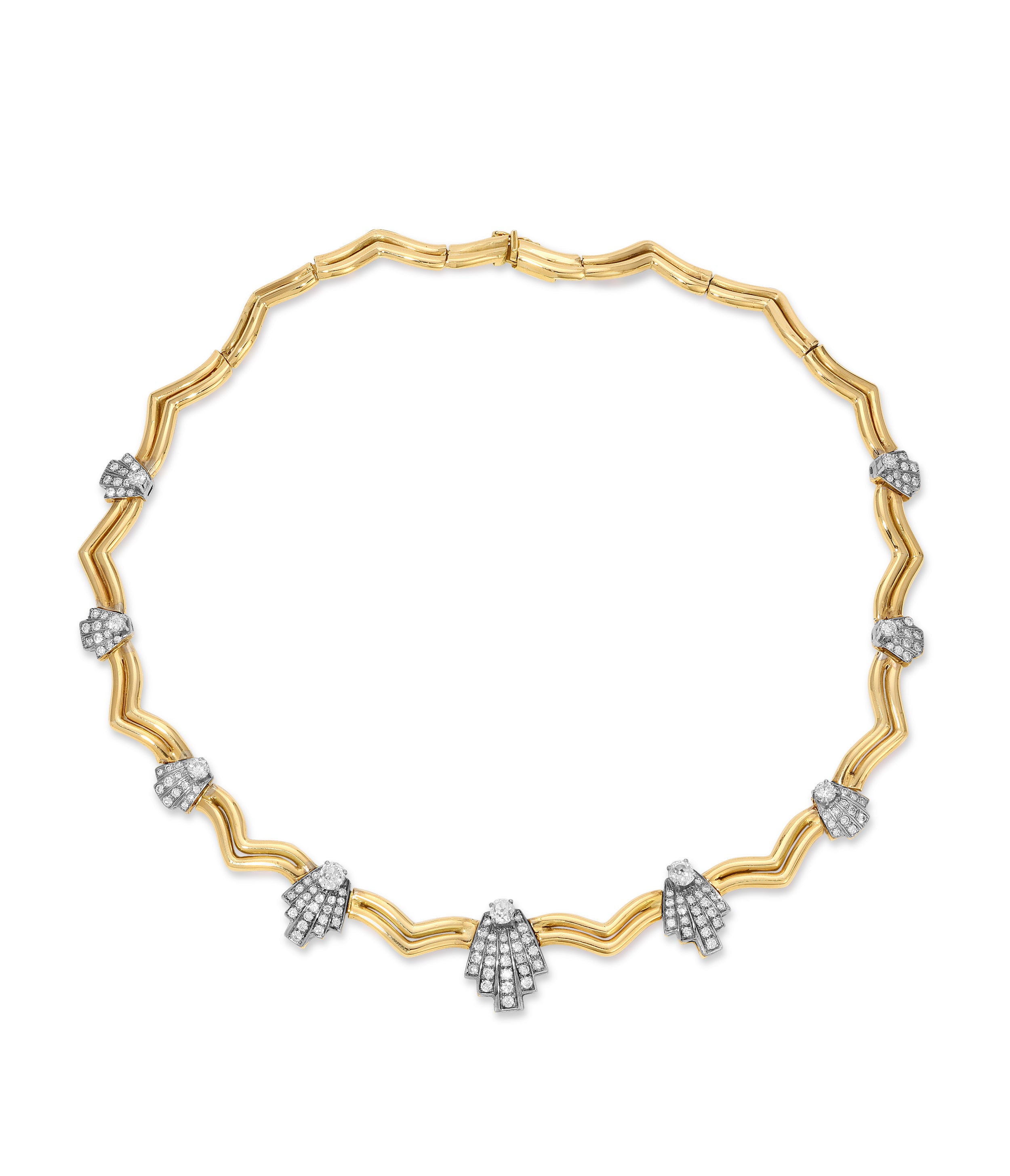 18K yellow gold, numerous single-cut, old European and old-mine cut diamonds weighing approximately 7.45 carats with H-I-J-K color and VS-SI2 clarity. Sun measures 1 1/2 inches, crescent measures 1 3/4 x 1 1/4 inches .Total weight: 23.28 grams.